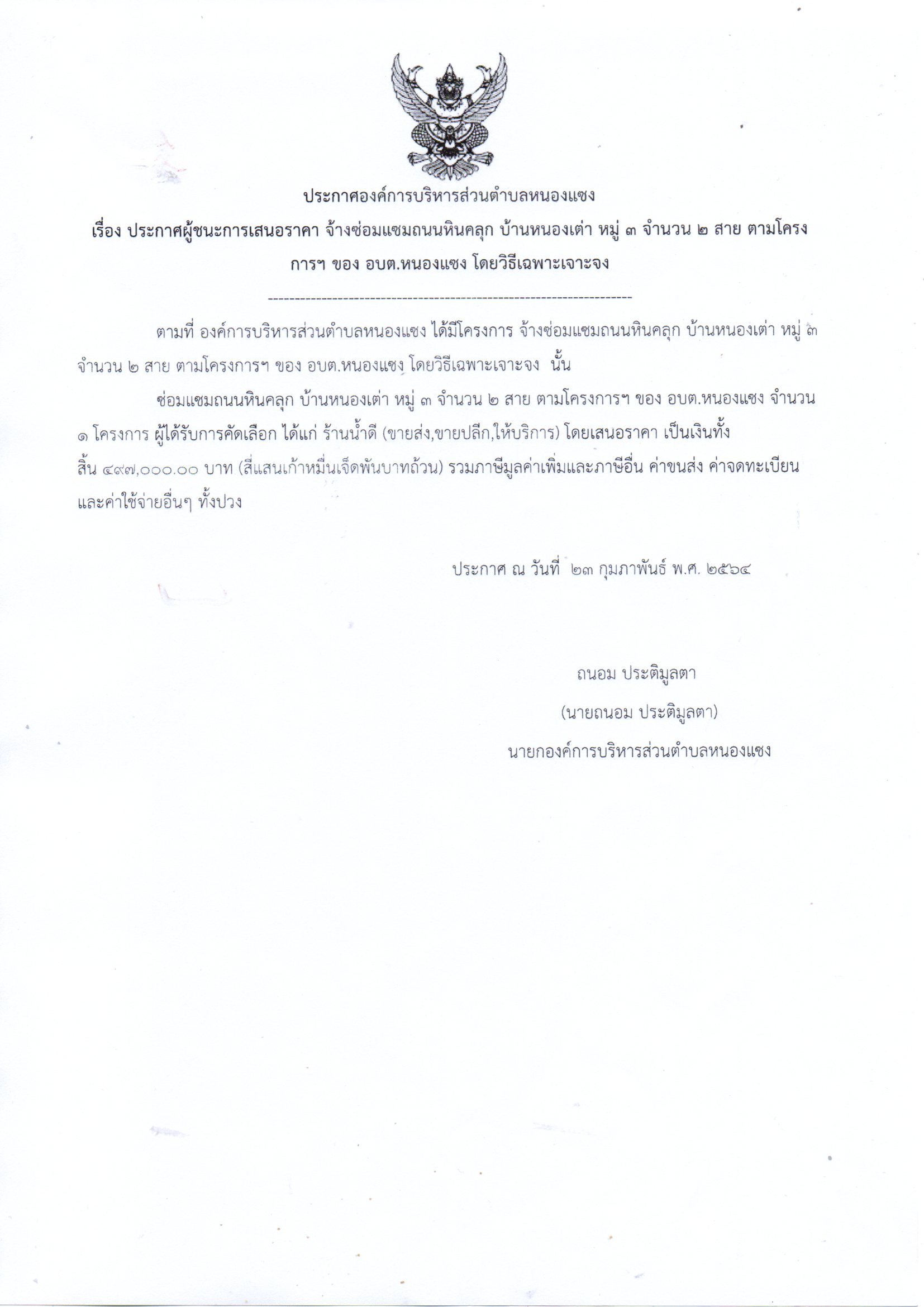 ประกาศองค์การบริหารส่วนตำบลหนองแซง เรื่อง ประกาศผู้ชนะงานจ้าง โครงการ ก่อสร้างถนนหินคลุก ม.3