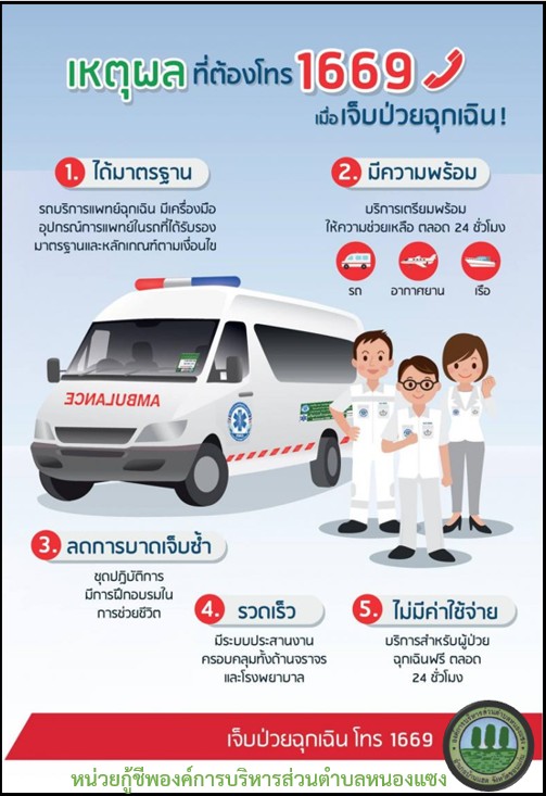 การแจ้งข้อมูลเบื้องต้นของท่านๆ คือการช่วยเหลือขั้นแรกที่สำคัญ ที่จะช่วยให้ผู้ป่วยฉุกเฉินมีโอกาสรอดและปลอดภัยมากขึ้น !!!! นอกจากนี้ ผู้ที่มีส่วนสำคัญที่จะทำให้ผู้ป่วยฉุกเฉินรอดและปลอดภัย ศูนย์รับแจ้งเหตุและสั่งการ ที่จะต้องทำหน้าที่อย่างหนัก ซึ่งในแต่ละครั้งพวกเขาเหล่าานี้ก็พบปัญหาจากการทำงาน คือ มีผู้โทรป่วนสายด่วน 1669 ไม่ต่ำกว่า 300 สายต่อวัน ดังนั้นอยากให้ทุกคนเข้าใจว่าสายด่วน 1669 คือสายด่วนแห่งชีวิต ดังนั้นโทรฟรีแต่อย่าโทรเล่น เพราะมีอีกหลายชีวิตที่รอคอยการช่วยเหลือ สำหรับการทำงานของศูนย์รับแจ้งเหตุและสังการนั้นจะมีเจ้าหน้าที่รับสายและเจ้าหน้าที่สื่อสาร ปฏิบัติงานตลอด 24 ชั่วโมง ส่วนศูนย์สั่งการ 1669 ในจังหวัดต่างๆ จะมีศูนย์สั่งการประจำโรงพยาบาลจังหวัด ซึ่งสามารถโทรแจ้ง 1669 ได้เช่นกัน หรือประสานงานสายด่วนองค์การบริหารส่วนตำบลหนองแซง ได้ที่เบอร์ 091-052-0911