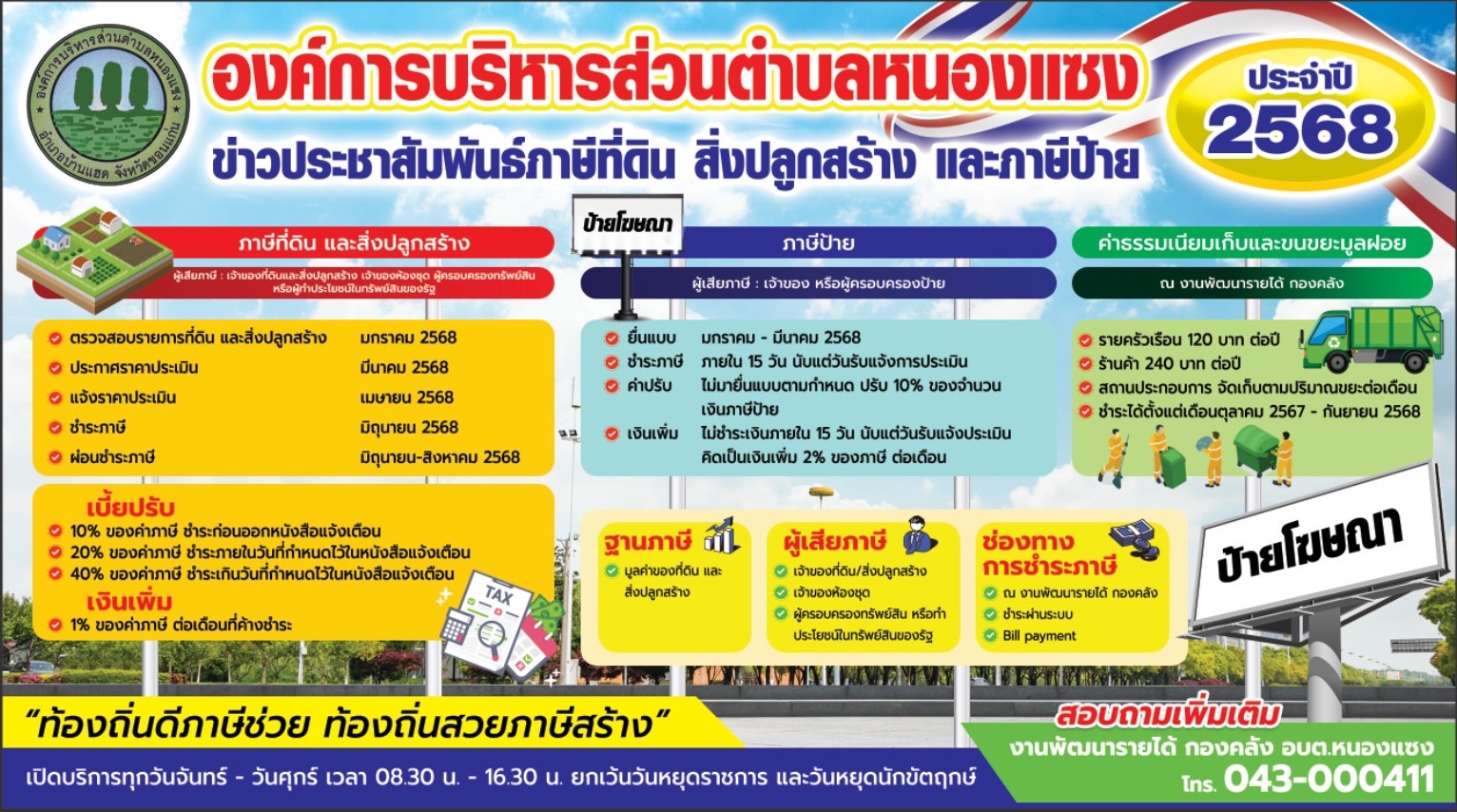 ประกาศองค์การบริหารส่วนตำบลหนองแซง เรื่องประชาสัมพันธ์ให้ผู้ครอบครองที่ดินรกร้างว่างเปล่า เข้าทำประโยชน์ในที่ดิน และการขยายเวลาการเก็บภาษีปี2568